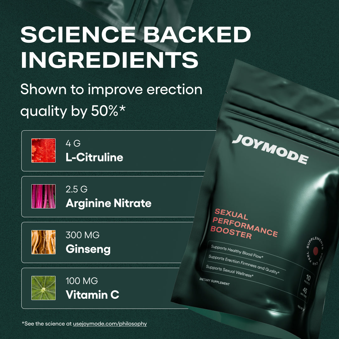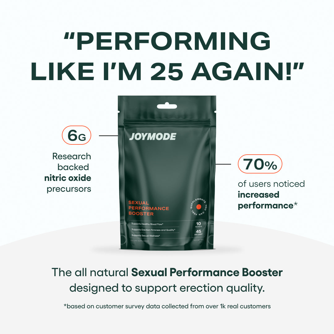 Formulated with the ideal dosage of L-Citrulline for daily use, JOYMODE's Performance Booster is crafted with four all-natural ingredients of L-Citrulline, Arginine Nitrate, Ginseng, and Vitamin C, ensuring a clean and safe solution for stronger erections, increased stamina, and optimal cardiovascular health. Free from harmful chemicals and synthetic additives, the formula is designed to support your body naturally.